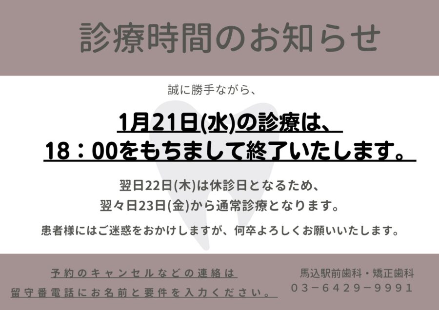 2026.1.20 | お知らせ【1月21日(水)の診療時間変更について】