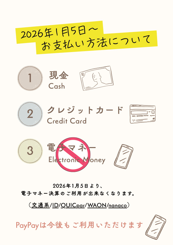 2026年1月5日から、当院では電子マネー決済(交通系/ID/QUICPay/WAON/nanaco)の取扱いを終了しましたのでお知らせいたします。